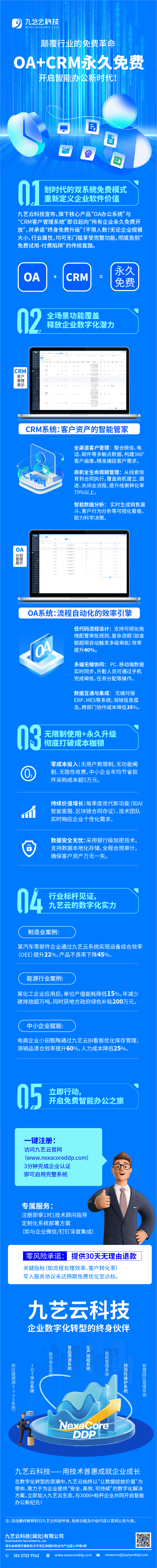 九艺云科技宣布,旗下核心产品“OA办公系统”与“CRM客户管理系统”即日起向“所有企业**免费开放”,并承诺“终身免费升级”!不限人数!无论企业规模大小、行业属性,均可无门槛享受完整功能,彻底告别“免费试用-付费陷阱”的传统套路。